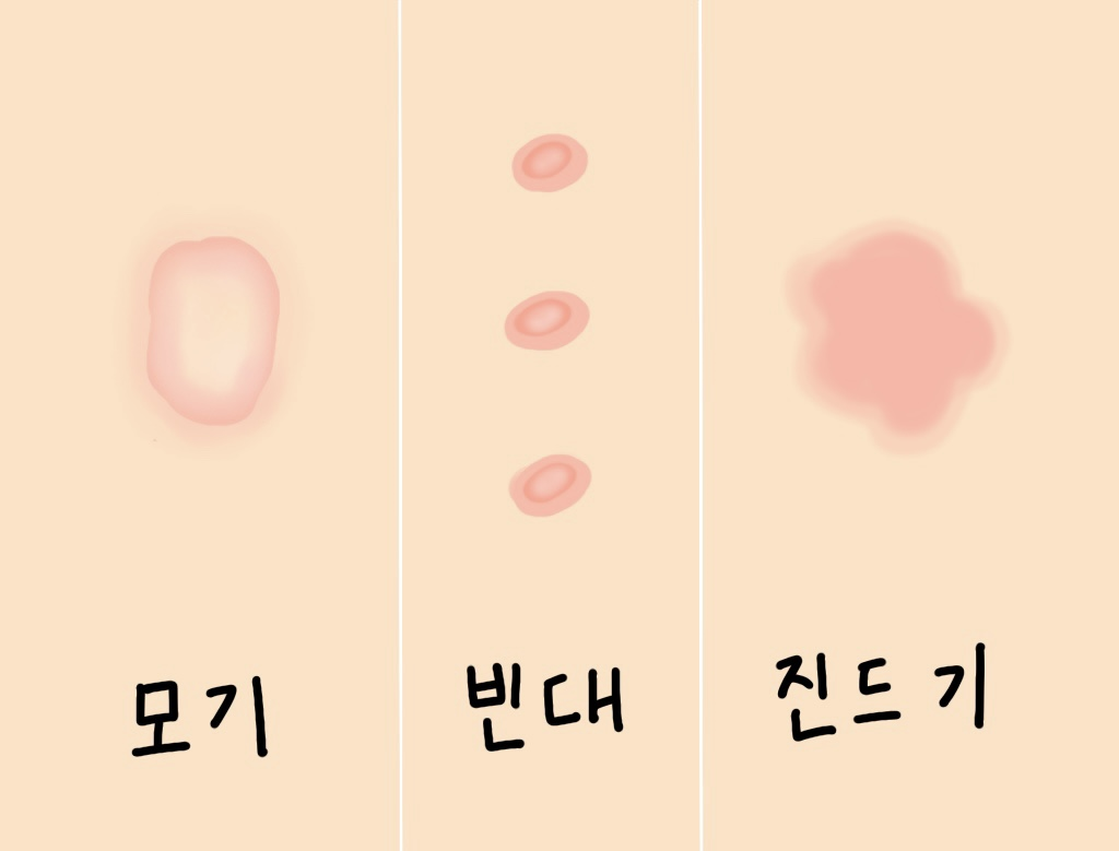 빈대 물린자국은 모기에게 물렸을 때와 마찬가지로 부으며 주변으로 퍼진 모습을 띕니다. 모기에게 물렸을 때처럼 작열감 증상이 나타날 수 있습니다. 이때 구별할 수 있는 차이점은 모기에 물렸을 때는 물린 곳을 중심으로 물린자국이 볼록하게 튀어나오지만, 빈대 물린자국은 평평하게 빨갛게 부어오르며 마치 송곳으로 피부를 찌른 듯이 직경 0.5~1.0mm로 움푹 파인다는 것을 확인한다면 모기 물린자국과 빈대 물린자국을 확실히 구별할 수 있게 됩니다.